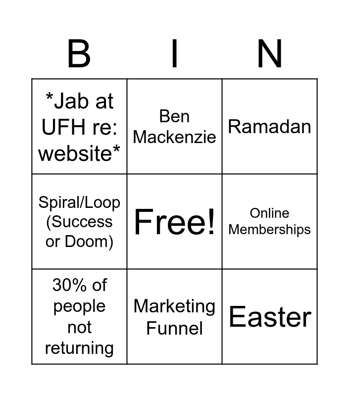 This bingo card has a free space and 9 words: 30% of people not returning, Ramadan, Ben Mackenzie, Spiral/Loop (Success or Doom), *Jab at UFH re: website*, Online Memberships, Easter, Work In-Studio and Marketing Funnel.
