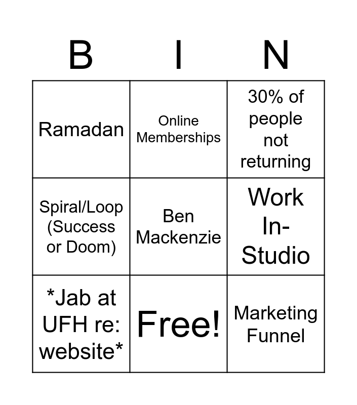 This bingo card has 10 words: Free!, 30% of people not returning, Ramadan, Ben Mackenzie, Spiral/Loop (Success or Doom), *Jab at UFH re: website*, Online Memberships, Easter, Work In-Studio and Marketing Funnel.