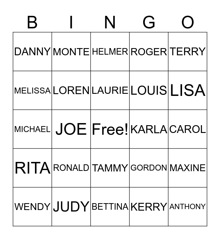 This bingo card has a free space and 24 words: RONALD, JUDY, LAURIE, WENDY, TERRY, DANNY, MELISSA, MONTE, KARLA, TAMMY, LOUIS, MICHAEL, GORDON, MAXINE, LOREN, KERRY, CAROL, HELMER, LISA, JOE, ANTHONY, RITA, ROGER and BETTINA.