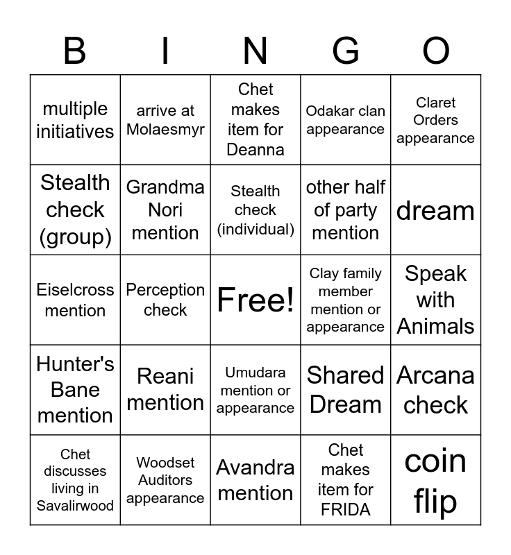 This bingo card has a free space and 44 words: travel roll, coin flip, wolf (not Chet), Chet discusses living in Savalirwood, Chet acquires more wood, Chet makes item for FRIDA, Chet makes item for Deanna, Claret Orders mention, Claret Orders appearance, Woodset Auditors appearance, Odakar clan appearance, Clay family member mention or appearance, Umudara mention or appearance, Reani mention, Little Mister, Avandra mention, Melora mention, Eiselcross mention, goat lost, dream, arrive at Molaesmyr, not yet at Molaesmyr, initiative, multiple initiatives, no initiative, Speak with Animals, Speak with Plants, Speak with Small Beasts, Shared Dream, Hunter's Bane mention, Wild Shape, Arcana check, Survival check, History check, Perception check, Investigation check, Charisma check, Saving throw, Stealth check (individual), Stealth check (group), other half of party mention, Dorian or Yu mention, Grandma Nori mention and party member unconscious.