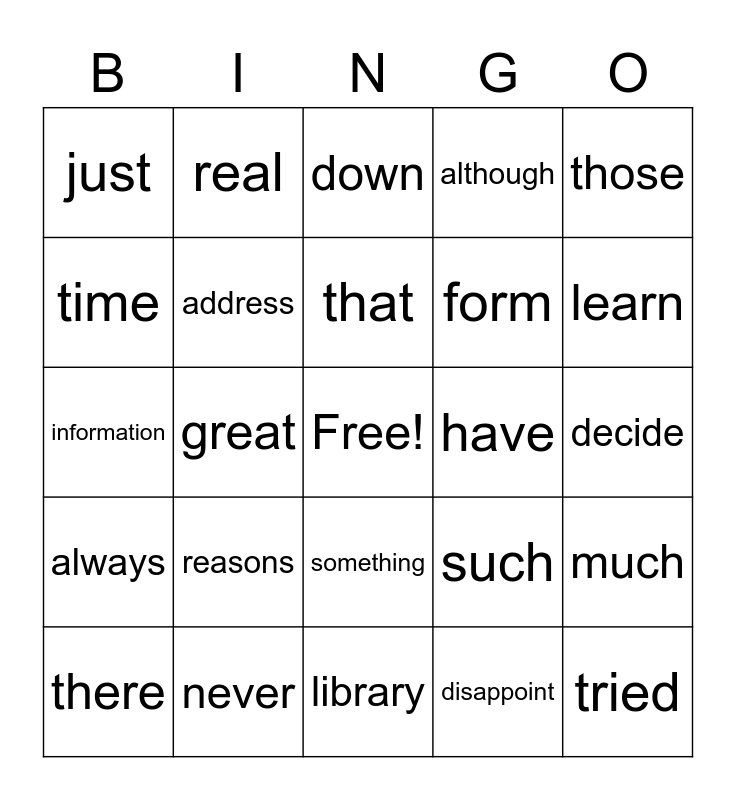 This bingo card has a free space and 25 words: reasons, library, that, there, those, just, time, real, have, something, form, information, such, much, address, name, decide, down, learn, great, tried, never, always, although and disappoint.