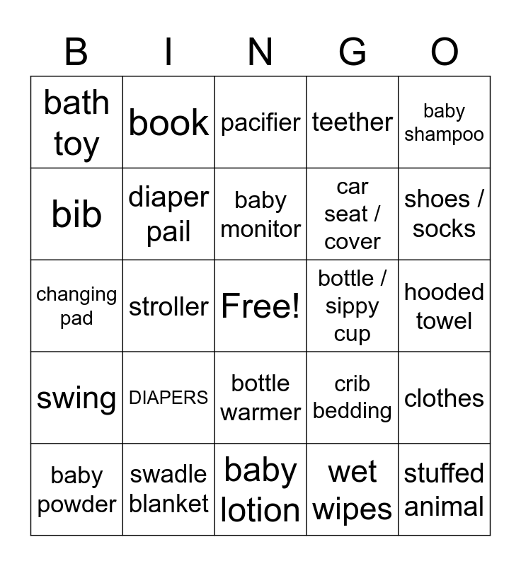 This bingo card has a free space and 25 words: DIAPERS, baby lotion, baby monitor, baby powder, baby shampoo, bath toy, bib, book, bottle / sippy cup, bottle warmer, car seat / cover, changing pad, crib bedding, clothes, diaper pail, hat or headband, hooded towel, pacifier, shoes / socks, stroller, stuffed animal, swadle blanket, swing, teether and wet wipes.