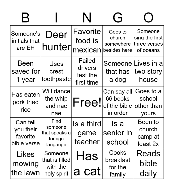 This bingo card has a free space and 24 words: Find someone that speaks a foreign langauge, Someone that is filled with the holy spirit, Failed drivers test the first time, Likes mowing the lawn, Someone sing the first three verses of oceans, Someone's initials that are EH, Been saved for 1 year, Deer hunter, Can say all 66 books of the bible in order, Is a third game teacher, Someone that has a dog, Has eaten pork fried rice, Is a senior in school, Been to church camp at least 2x, Uses crest toothpaste, Cooks breakfast for the family, Goes to a school other than yours, Favorite food is mexican, Lives in a two story house, Will dance the whip and nae nae, Reads bible daily, Can tell you their favorite bible verse, Goes to church somewhere besides here and Has a cat.