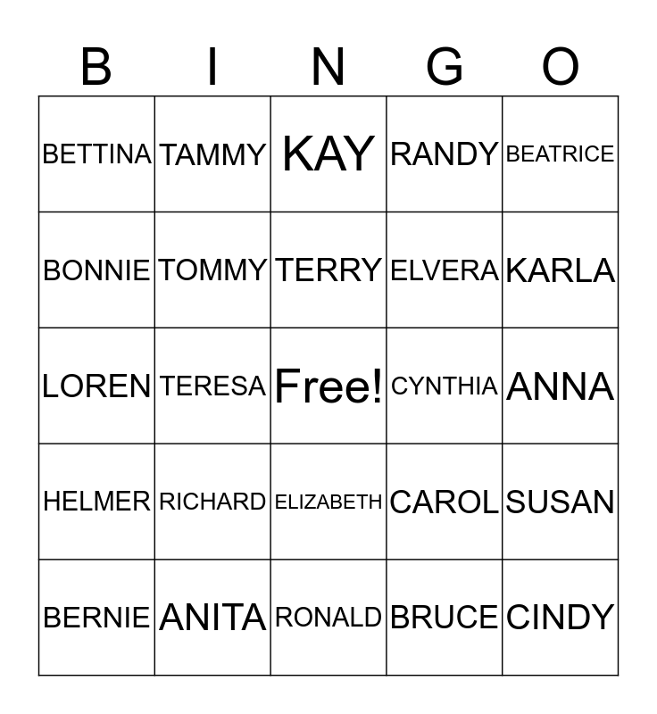 This bingo card has a free space and 24 words: RICHARD, ANITA, TERRY, BERNIE, BEATRICE, BETTINA, BONNIE, TAMMY, CYNTHIA, ELIZABETH, ELVERA, LOREN, CAROL, SUSAN, TOMMY, BRUCE, ANNA, KAY, KARLA, TERESA, CINDY, HELMER, RANDY and RONALD.