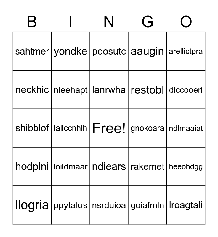This bingo card has a free space and 29 words: llogria, tanhpe, lailccnhih, rdlapoe, sahtmer, poosutc, nleehapt, loildmaar, gnokoara, ppytalus, ndlmaaiat, lroagtali, nsrduioa, goiafmln, dlccooeri, aaaycpb, ndiears, hodplni, arellictpra, shibblof, rakemet, orconac, restobl, neckhic, aaugin, yondke, heeohdgg, lanrwha and restoro.