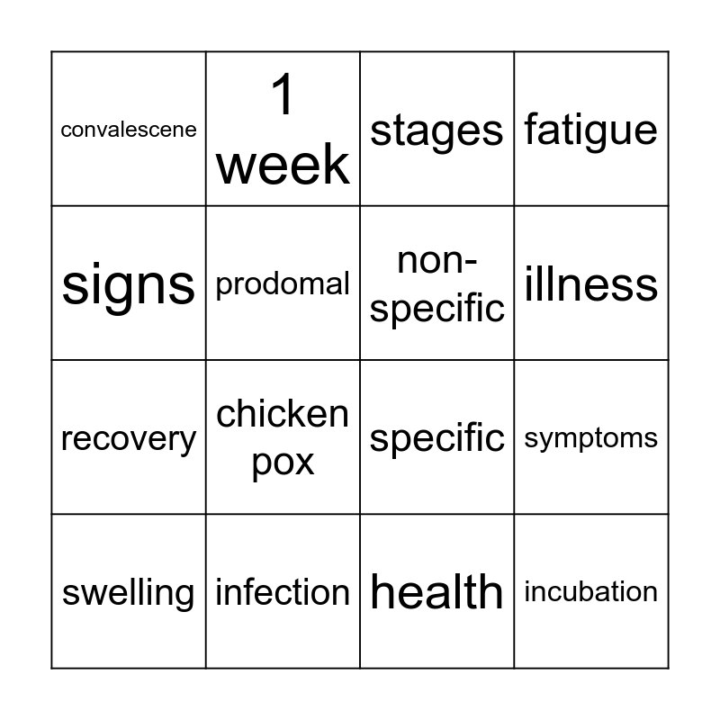 This bingo card has 16 words: infection, symptoms, stages, convalescene, recovery, 1 week, specific, health, signs, prodomal, swelling, fatigue, chicken pox, illness, non- specific and incubation.