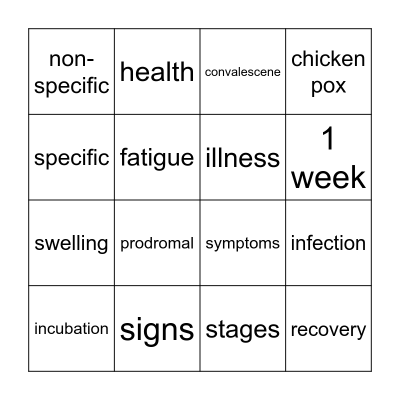 This bingo card has 16 words: signs, infection, convalescene, non-specific, swelling, health, symptoms, stages, specific, fatigue, incubation, chicken pox, prodromal, 1 week, illness and recovery.