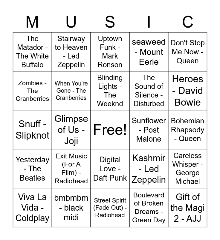 This bingo card has a free space and 62 words: Strawberry Fields Forever - The Beatles, bmbmbm - black midi, Follow You Follow Me - Genesis, Yesterday - The Beatles, Videotape - Radiohead, Strobelite - Gorillaz, When You're Gone - The Cranberries, Pain - PinkPantheress, The Sound of Silence - Disturbed, Fly Away - Lenny Kravitz, seaweed - Mount Eerie, Heroes And Villains - The Beach Boys, Zombies - The Cranberries, Hellfire - black midi, Cthulhu - Grailknights, The Matador - The White Buffalo, Gift of the Magi 2 - AJJ, Don't Stop Me Now - Queen, Thriller - Michael Jackson, Blinding Lights - The Weeknd, Sunflower - Post Malone, Uptown Funk - Mark Ronson, Viva La Vida - Coldplay, Boulevard of Broken Dreams - Green Day, In The End - Linkin Park, Californication - Red Hot Chili Peppers, Wannabe - Spice Girls, Smells Like Teen Spirit - Nirvana, Careless Whisper - George Michael, Miracle - Calvin Harris, Billie Jean - Michael Jackson, Eye of the Tiger - Survivor, Another Brick In The Wall - Pink Floyd, Dancing Queen - ABBA, Bohemian Rhapsody - Queen, Stairway to Heaven - Led Zeppelin, Hey Jude - The Beatles, Can't Help Falling in Love - Elvis Presley, Glimpse of Us - Joji, Clint Eastwood - Gorillaz, Snuff - Slipknot, September - Earth, Wind & Fire, Exit Music (For A Film) - Radiohead, Space Oddity - David Bowie, Heroes - David Bowie, Kashmir - Led Zeppelin, On Melancholy Hill - Gorillaz, Burn the Witch - Radiohead, Birds - Death Grips, RISE! - Tyler, The Creator, Digital Love - Daft Punk, Street Spirit (Fade Out) - Radiohead, Flashing Light - Kanye West#, Helter Skelter - The Beatles, GONE, GONE / THANK YOU, Breathe - The Prodigy, Intersteller Overdrive - Pink Floyd, My Way - Frank Sinatra, Dilemma - Death Grips, Boogie Wonderland - Earth, Wind & Fire, Another Song About The Weekend - A Day To Remember and A Sky Fully of Star - Coldplay.