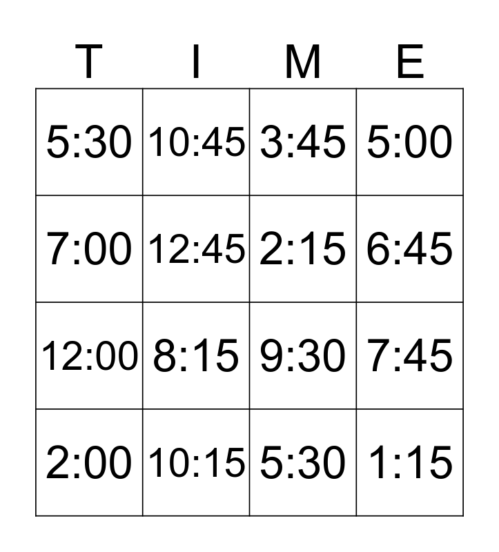 This bingo card has a free space and 15 words: 2:00, 1:15, 3:45, 5:30, 6:45, 7:00, 8:15, 5:30, 12:45, 12:00, 7:45, 5:00, 2:15, 10:45 and 10:15.
