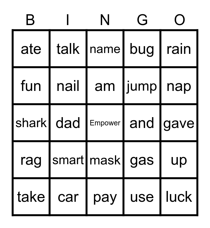 This bingo card has a free space and 33 words: grab, pack, dad, made, rag, nail, rain, take, talk, all, am, name, champ, man, and, nap, car, shark, smart, gas, mask, cat, ate, gave, pay, luck, bug, jump, fun, up, bus, use and nut.