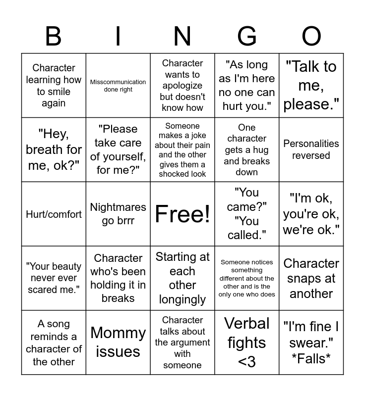 This bingo card has a free space and 24 words: Character who's been holding it in breaks, Mommy issues, Someone makes a joke about their pain and the other gives them a shocked look, A song reminds a character of the other, "Talk to me, please.", Character learning how to smile again, "Hey, breath for me, ok?", Misscommunication done right, "You came?" "You called.", Starting at each other longingly, One character gets a hug and breaks down, Hurt/comfort, Someone notices something different about the other and is the only one who does, Character snaps at another, "Please take care of yourself, for me?", Verbal fights <3, "I'm ok, you're ok, we're ok.", Character wants to apologize but doesn't know how, Personalities reversed, Nightmares go brrr, "I'm fine I swear." *Falls*, "Your beauty never ever scared me.", "As long as I'm here no one can hurt you." and Character talks about the argument with someone.