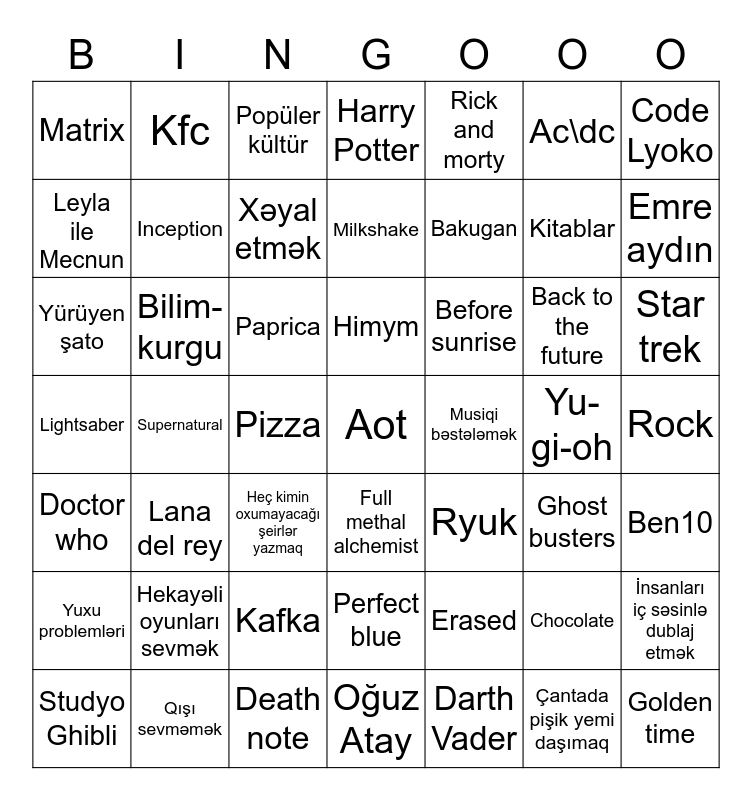 This bingo card has a free space and 48 words: Doctor who, Supernatural, Death note, Full methal alchemist, Bakugan, Yu-gi-oh, Code Lyoko, Studyo Ghibli, Bilim-kurgu, Pizza, Harry Potter, Rick and morty, Back to the future, Star trek, Lightsaber, Hekayəli oyunları sevmək, Popüler kültür, Himym, Erased, Ac\dc, Emre aydın, Leyla ile Mecnun, Kfc, Xəyal etmək, Darth Vader, Kitablar, Rock, Yuxu problemləri, Lana del rey, Paprica, Perfect blue, Before sunrise, Chocolate, İnsanları iç səsinlə dublaj etmək, Matrix, Qışı sevməmək, Heç kimin oxumayacağı şeirlər yazmaq, Oğuz Atay, Musiqi bəstələmək, Çantada pişik yemi daşımaq, Ben10, Yürüyen şato, Inception, Kafka, Milkshake, Ryuk, Ghost busters and Golden time.