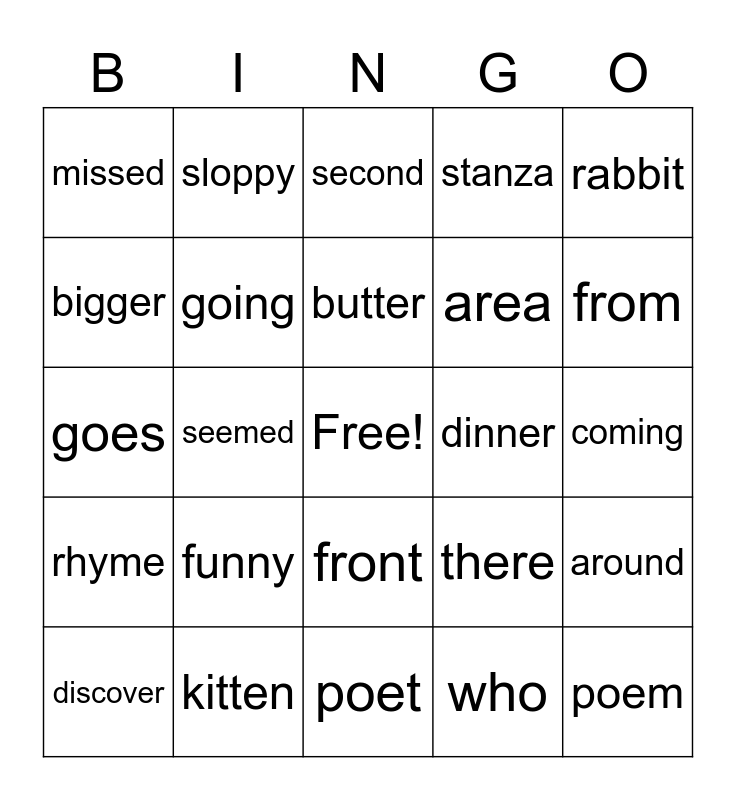 This bingo card has a free space and 24 words: funny, kitten, butter, discover, rabbit, missed, bigger, sloppy, dinner, front, area, goes, there, around, going, who, coming, second, from, seemed, poem, rhyme, stanza and poet.