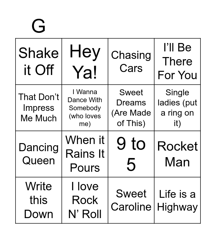 This bingo card has 26 words: Free!, Never Gonna Give You Up, Single ladies (put a ring on it), Dancing in the Moonlight, That Don’t Impress Me Much, Shake it Off, I Wanna Dance With Somebody (who loves me), Hey Ya!, Sweet Caroline, Yeah!, Dancing Queen, 9 to 5, Since U Been Gone, Umbrella, Rocket Man, Signed, Sealed, Delivered, I’ll Be There For You, Life is a Highway, Chasing Cars, Write this Down, When it Rains It Pours, Jack & Diane, I love Rock N’ Roll, Run the World (Girls), Sweet Dreams (Are Made of This) and You Belong With Me.