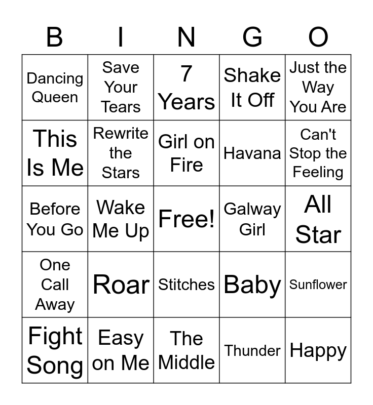 This bingo card has a free space and 24 words: Roar, Easy on Me, Girl on Fire, Fight Song, Just the Way You Are, Dancing Queen, This Is Me, Save Your Tears, Galway Girl, Stitches, Havana, Before You Go, Baby, Sunflower, Rewrite the Stars, Thunder, All Star, 7 Years, Can't Stop the Feeling, Wake Me Up, Happy, One Call Away, Shake It Off and The Middle.