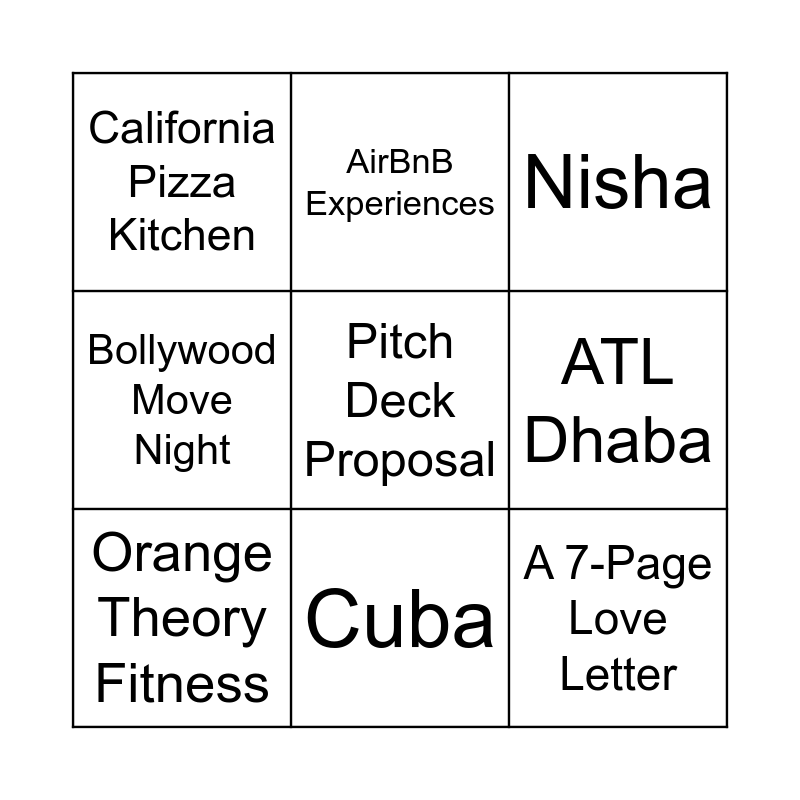 This bingo card has 15 words: Hinge, Mirza Ghalib Poetry Reading, Nisha, California Pizza Kitchen, Cuba, Pitch Deck Proposal, Sushi & Tapas, Bowling, ATL Dhaba, A 7-Page Love Letter, Built a tent and camped indoors, Bollywood Move Night, Orange Theory Fitness, AirBnB Experiences and Car got booted.