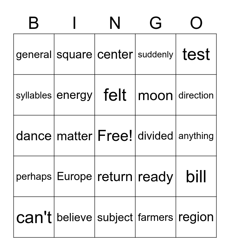 This bingo card has a free space and 24 words: Europe, believe, felt, can't, test, general, syllables, square, divided, return, moon, dance, ready, bill, energy, farmers, anything, center, direction, matter, region, perhaps, suddenly and subject.