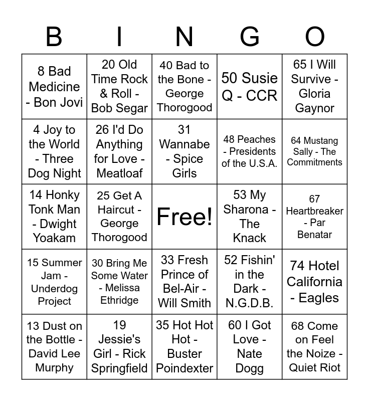 This bingo card has a free space and 75 words: 1 Backstreet's Back - Backstreet Boys, 16 Stacy's Mom - Fountains of Wayne, 31 Wannabe - Spice Girls, 46 Tennesse Whisky - Chris Stapleton, 61 Livin la Vida Loca - Ricky Martin, 2 Are you Jimmy Ray? - Jimmy Ray, 17 Gettin' Jiggy Wit It - Will Smith, 32 I Want You - Savage Garden, 47 Killing me Softly - Lauryn Hill, 62 Good Vibrations - Marky Mark, 3 Get the Party Started - Pink, 18 Play that Funk Music - Wild Cherry, 33 Fresh Prince of Bel-Air - Will Smith, 48 Peaches - Presidents of the U.S.A., 63 If I had a $ Million $ - Barenaked Ladies, 4 Joy to the World - Three Dog Night, 19 Jessie's Girl - Rick Springfield, 34 Rasputin - Boney M., 49 Red Red Wine - UB40, 64 Mustang Sally - The Commitments, 5 Ain't No Sunshine - Bill Withers, 20 Old Time Rock & Roll - Bob Segar, 35 Hot Hot Hot - Buster Poindexter, 50 Susie Q - CCR, 65 I Will Survive - Gloria Gaynor, 6 You Sexy Thing - Hot Chocolate, 21 Through the Grapevine - Marvin Gaye, 36 How Bizarre - OMC, 51 You Can Call Me Al - Paul Simon, 66 Little Red Corvette - Prince, 7 I'm to Sexy - Right Said Fred, 22 Sundown - Gordon Lightfoot, 37 Boot Scootin' Boogie - Brooks & Dunn, 52 Fishin' in the Dark - N.G.D.B., 67 Heartbreaker - Par Benatar, 8 Bad Medicine - Bon Jovi, 23 Sweet Home Alabama - Lynyrd Skynyrd, 38 Long Cool Woman - The Hollies, 53 My Sharona - The Knack, 68 Come on Feel the Noize - Quiet Riot, 9 Addicted to Love - Robert Palmer, 24 New Orleans is Sinking - Tragically Hip, 39 Walk This Way - Aerosmith, 54 Black Betty - Ram Jam, 69 I Wanna Be Sedated - Ramones, 10 Tweeter and the Monkey Man - Headstones, 25 Get A Haircut - George Thorogood, 40 Bad to the Bone - George Thorogood, 55 Holding out for a Hero - Bonnie Tyler, 70 Born to be Wild - Steppenwolf, 11 Summer Nights - Grease, 26 I'd Do Anything for Love - Meatloaf, 41 My Best Friends Girl - The Cars, 56 Kokomo - Beach Boys, 71 Up on Cripple Creek - The Band, 12 Take me Homme, Country Roads - John Denver, 27 Luckenbach Texas - Waylon Jennings, 42 Chicken Fried - Zac Brown Band, 57 Hound Dog - Elvis Presley, 72 Meet In the Middle - Diamond Rio, 13 Dust on the Bottle - David Lee Murphy, 28 U Can't Touch This - MC Hammer, 43 Drivin' My Life Away - Eddie Rabbitt, 58 Hey Porter - Johnny Cash, 73 Crazy Little Thing Called Love - Queen, 14 Honky Tonk Man - Dwight Yoakam, 29 Give A Little Bit - Supertramp, 44 Baker Street - Gerry Rafferty, 59 Streets of Bakersfield - Buck Owens, 74 Hotel California - Eagles, 15 Summer Jam - Underdog Project, 30 Bring Me Some Water - Melissa Ethridge, 45 Paddy Murphy - Great Big Sea, 60 I Got Love - Nate Dogg and 75 I Walk The Line - Johnny Cash.