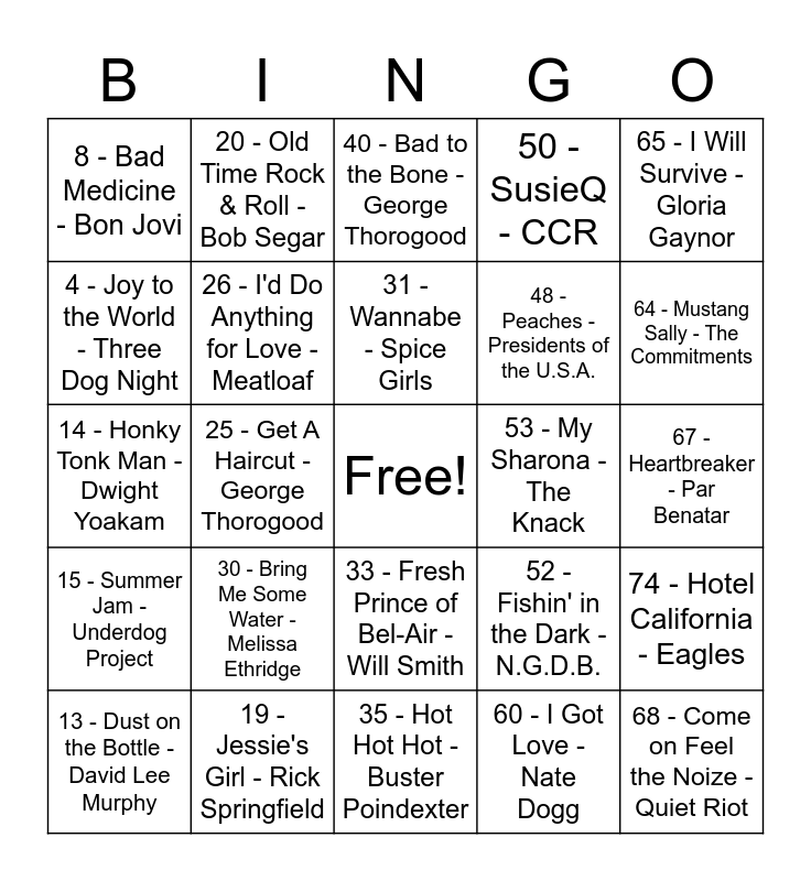 This bingo card has a free space and 75 words: 1 - Backstreet's Back - Backstreet Boys, 16 - Stacy's Mom - Fountains of Wayne, 31 - Wannabe - Spice Girls, 46 - Tennesse Whisky - Chris Stapleton, 61 - Livin la Vida Loca - Ricky Martin, 2 - Are you Jimmy Ray? - Jimmy Ray, 17 - Gettin' Jiggy Wit It - Will Smith, 32 - I Want You - Savage Garden, 47 - Killing me Softly - Lauryn Hill, 62 - Good Vibrations - Marky Mark, 3 - Get the Party Started - Pink, 18 - Play that Funk Music - Wild Cherry, 33 - Fresh Prince of Bel-Air - Will Smith, 48 - Peaches - Presidents of the U.S.A., 63 - If I had a $ Million $ - Barenaked Ladies, 4 - Joy to the World - Three Dog Night, 19 - Jessie's Girl - Rick Springfield, 34 - Rasputin - Boney M., 49 - Red Red Wine - UB40, 64 - Mustang Sally - The Commitments, 5 - Ain't No Sunshine - Bill Withers, 20 - Old Time Rock & Roll - Bob Segar, 35 - Hot Hot Hot - Buster Poindexter, 50 - SusieQ - CCR, 65 - I Will Survive - Gloria Gaynor, 6 - You Sexy Thing - Hot Chocolate, 21 - Through the Grapevine - Marvin Gaye, 36 - How Bizarre - OMC, 51 - You Can Call Me Al - Paul Simon, 66 - Little Red Corvette - Prince, 7 - I'm to Sexy - Right Said Fred, 22 - Sundown - Gordon Lightfoot, 37 - Boot Scootin' Boogie - Brooks & Dunn, 52 - Fishin' in the Dark - N.G.D.B., 67 - Heartbreaker - Par Benatar, 8 - Bad Medicine - Bon Jovi, 23 - Sweet Home Alabama - Lynyrd Skynyrd, 38 - Long Cool Woman - The Hollies, 53 - My Sharona - The Knack, 68 - Come on Feel the Noize - Quiet Riot, 9 - Addicted to Love - Robert Palmer, 24 - New Orleans is Sinking - Tragically Hip, 39 - Walk This Way - Aerosmith, 54 - Black Betty - Ram Jam, 69 - I Wanna Be Sedated - Ramones, 10 - Tweeter and the Monkey Man - Headstones, 25 - Get A Haircut - George Thorogood, 40 - Bad to the Bone - George Thorogood, 55 - Holding out for a Hero - Bonnie Tyler, 70 - Born to be Wild - Steppenwolf, 11 - Summer Nights - Grease, 26 - I'd Do Anything for Love - Meatloaf, 41 - My Best Friends Girl - The Cars, 56 - Kokomo - Beach Boys, 71 - Up on Cripple Creek - The Band, 12 - Take me Homme, Country Roads - John Denver, 27 - Luckenbach Texas - Waylon Jennings, 42 - Chicken Fried - Zac Brown Band, 57 - Hound Dog - Elvis Presley, 72 - Meet In the Middle - Diamond Rio, 13 - Dust on the Bottle - David Lee Murphy, 28 - U Can't Touch This - MC Hammer, 43 - Drivin' My Life Away - Eddie Rabbitt, 58 - Hey Porter - Johnny Cash, 73 - Crazy Little Thing Called Love - Queen, 14 - Honky Tonk Man - Dwight Yoakam, 29 - Give A Little Bit - Supertramp, 44 - Baker Street - Gerry Rafferty, 59 - Streets of Bakersfield - Buck Owens, 74 - Hotel California - Eagles, 15 - Summer Jam - Underdog Project, 30 - Bring Me Some Water - Melissa Ethridge, 45 - Paddy Murphy - Great Big Sea, 60 - I Got Love - Nate Dogg and 75 - I Walk The Line - Johnny Cash.