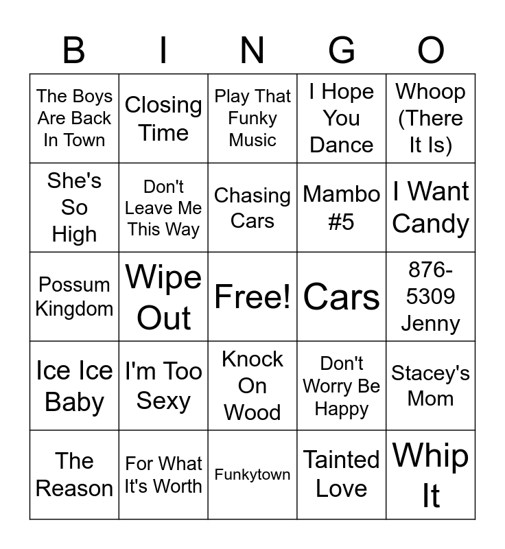 This bingo card has a free space and 30 words: For What It's Worth, Monster Mash, Wipe Out, Love Hurts, The Boys Are Back In Town, Play That Funky Music, Don't Leave Me This Way, Knock On Wood, Cars, Funkytown, 876-5309 Jenny, Whip It, Tainted Love, Mickey, I Want Candy, The Warrior, Don't Worry Be Happy, Ice Ice Baby, I'm Too Sexy, Whoop (There It Is), Possum Kingdom, Macarena, Closing Time, Mambo #5, She's So High, I Hope You Dance, Stacey's Mom, The Reason, Chasing Cars and Say Something.