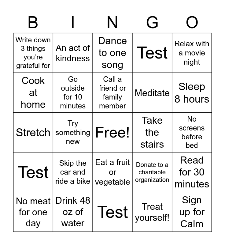 This bingo card has a free space and 24 words: Skip the car and ride a bike, Drink 48 oz of water, Call a friend or family member, No meat for one day, Relax with a movie night, Write down 3 things you’re grateful for, Cook at home, An act of kindness, Take the stairs, Eat a fruit or vegetable, Meditate, Stretch, Donate to a charitable organization, Read for 30 minutes, Go outside for 10 minutes, Treat yourself!, No screens before bed, Dance to one song, Sleep 8 hours, Try something new, Sign up for Calm, Test, Test and Test.