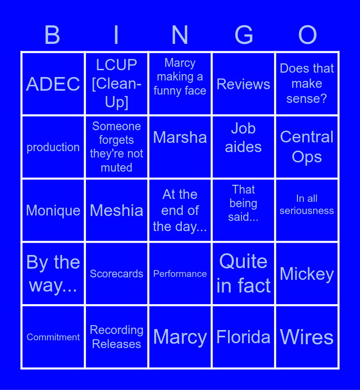 This bingo card has a free space and 29 words: Payoffs, Recording Releases, Marcy making a funny face, California, Does that make sense?, ADEC, Someone forgets they're not muted, Marsha, That being said..., Mickey, Commitment, Meshia, Florida, Wires, Monique, Texas, Marcy, Quite in fact, Central Ops, By the way..., Scorecards, I will say that..., Job aides, In all seriousness, production, LCUP [Clean-Up], Performance, Reviews and two people on the same cam.