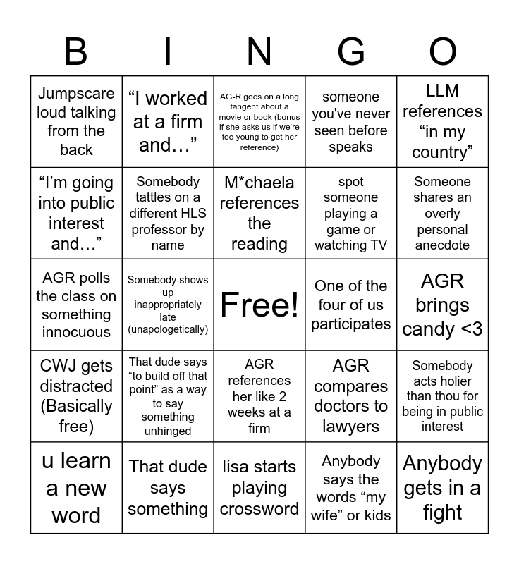 This bingo card has a free space and 24 words: That dude says “to build off that point” as a way to say something unhinged, That dude says something, M*chaela references the reading, u learn a new word, LLM references “in my country”, Jumpscare loud talking from the back, “I’m going into public interest and…”, “I worked at a firm and…”, One of the four of us participates, AGR references her like 2 weeks at a firm, spot someone playing a game or watching TV, AGR polls the class on something innocuous, AGR compares doctors to lawyers, Somebody acts holier than thou for being in public interest, Somebody tattles on a different HLS professor by name, Anybody says the words “my wife” or kids, AGR brings candy <3, AG-R goes on a long tangent about a movie or book (bonus if she asks us if we’re too young to get her reference), Someone shares an overly personal anecdote, Somebody shows up inappropriately late (unapologetically), Anybody gets in a fight, CWJ gets distracted (Basically free), someone you've never seen before speaks and lisa starts playing crossword.