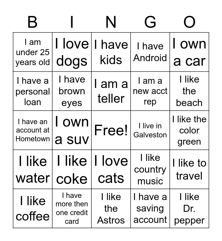 This bingo card has a free space and 24 words: I like coffee, I like coke, I am a teller, I have a saving account, I own a car, I am under 25 years old, I love dogs, I have kids, I live in Galveston, I like the color green, I have an account at Hometown, I have brown eyes, I like country music, I like to travel, I have a personal loan, I have more then one credit card, I like the Astros, I have Android, I like the beach, I like water, I own a suv, I love cats, I am a new acct rep and I like Dr. pepper.