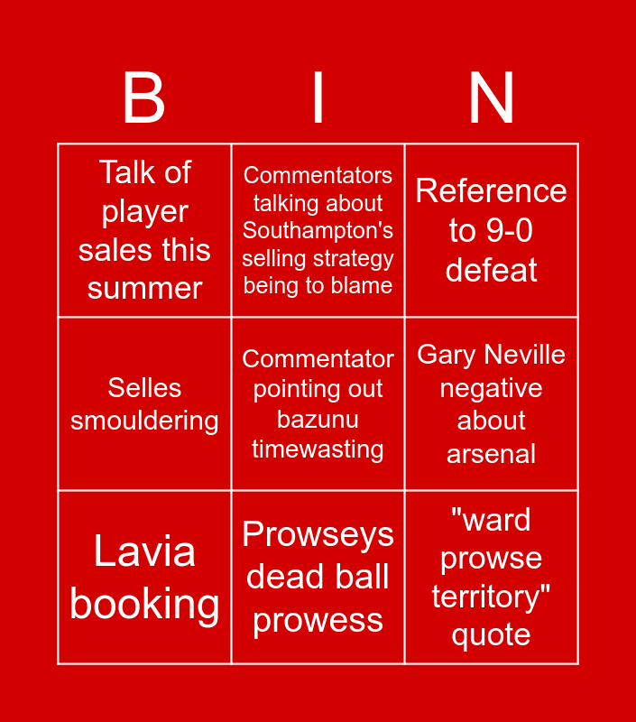 This bingo card has 10 words: Prowseys dead ball prowess, Reference to 9-0 defeat, Talk of player sales this summer, Commentator pointing out bazunu timewasting, Selles smouldering, Lavia booking, Commentators talking about Southampton's selling strategy being to blame, Jesus goal, Gary Neville negative about arsenal and "ward prowse territory" quote.