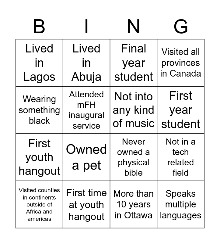 This bingo card has 18 words: Owned a pet, Speaks multiple languages, Final year student, Lived in Lagos, Never owned a physical bible, Visited all provinces in Canada, Visited counties in continents outside of Africa and americas, Lived in Abuja, First year student, First youth hangout, More than 10 years in Ottawa, Wearing something black, Not in a tech related field, Attended mFH inaugural service, Not into any kind of music, Not a pizza person, First time at youth hangout and Not in a tech related field.