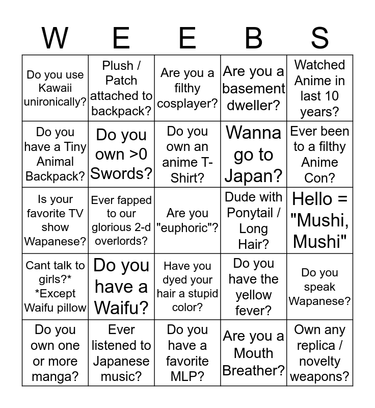 This bingo card has 25 words: Do you have a Waifu?, Do you have a favorite MLP?, Do you own an anime T-Shirt?, Do you own one or more manga?, Watched Anime in last 10 years?, Do you use Kawaii unironically?, Do you have a Tiny Animal Backpack?, Plush / Patch attached to backpack?, Dude with Ponytail / Long Hair?, Have you dyed your hair a stupid color?, Wanna go to Japan?, Is your favorite TV show Wapanese?, Do you have the yellow fever?, Do you speak Wapanese?, Do you own >0 Swords?, Own any replica / novelty weapons?, Hello = "Mushi, Mushi", Are you a filthy cosplayer?, Ever been to a filthy Anime Con?, Ever fapped to our glorious 2-d overlords?, Are you "euphoric"?, Ever listened to Japanese music?, Cant talk to girls?* *Except Waifu pillow, Are you a basement dweller? and Are you a Mouth Breather?.