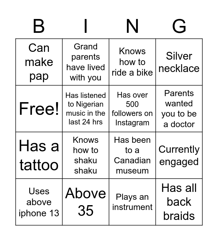 This bingo card has 16 words: Above 35, Currently engaged, Knows how to ride a bike, Can make pap, Has a tattoo, Grand parents have lived with you, Has been to a Canadian museum, Plays an instrument, Free!, Has listened to Nigerian music in the last 24 hrs, Uses above iphone 13, Silver necklace, Knows how to shaku shaku, Parents wanted you to be a doctor, Has over 500 followers on Instagram and Has all back braids.