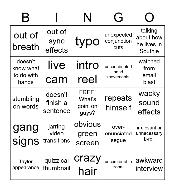 This bingo card has a free space and 34 words: meat & potatoes, uncomfortable zoom, shitty b-roll, double intro, gang signs, live cam, talking about how he lives in Southie, Taylor appearance, out of sync effects, poor clothing choice, intro reel, typo, text says what he's saying, bad audio, repeats himself, watched from email blast, quizzical thumbnail, stumbling on words, jarring video transitions, over-enunciated segue, obvious green screen, "I get so many calls", out of breath, wacky sound effects, crazy hair, awkward interview, unexpected conjunction cuts, obvious reading, uncoordinated hand movements, doesn't know what to do with hands, rambling, doesn't finish a sentence, irrelevant or unnecessary b-roll and "TWO".
