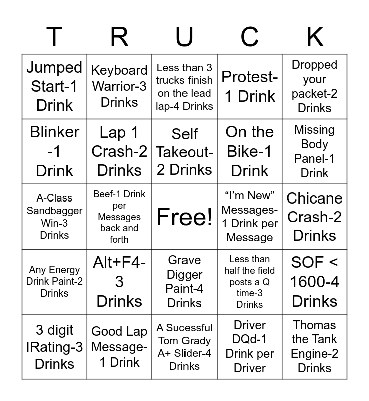 This bingo card has a free space and 31 words: A Sucessful Tom Grady A+ Slider-4 Drinks, T-Bone Takeout-2 Drinks, Beef-1 Drink per Messages back and forth, Unsuccessful Tom Grady Slider-2 Drinks, Jumped Start-1 Drink, Less than 3 trucks finish on the lead lap-4 Drinks, Lap 1 Crash-2 Drinks, Less than half the field posts a Q time-3 Drinks, “I’m New” Messages-1 Drink per Message, Driver DQd-1 Drink per Driver, Chicane Crash-2 Drinks, Thomas the Tank Engine-2 Drinks, “Good Luck” Messages-1 Drink per Message, HWY 8 Casualty-3 Drinks, Missing Body Panel-1 Drink, Lapper Takes Out the Leader-Finish Drink, SOF < 1600-4 Drinks, Alt+F4-3 Drinks, Any Energy Drink Paint-2 Drinks, Grave Digger Paint-4 Drinks, Dropped your packet-2 Drinks, Premature Celebration-2 Drinks, 3 digit IRating-3 Drinks, Keyboard Warrior-3 Drinks, On the Bike-1 Drink, Blinker -1 Drink, Protest-1 Drink, A-Class Sandbagger Win-3 Drinks, Good Lap Message-1 Drink, Self Takeout-2 Drinks and Canadian Sorry-1 Drink.