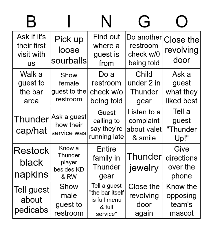 This bingo card has a free space and 24 words: Know a Thunder player besides KD & RW, Show male guest to restroom, Do a restroom check w/o being told, Tell guest about pedicabs, Close the revolving door, Ask if it's their first visit with us, Walk a guest to the bar area, Pick up loose sourballs, Listen to a complaint about valet & smile, Entire family in Thunder gear, Child under 2 in Thunder gear, Thunder cap/hat, Thunder jewelry, Give directions over the phone, Show female guest to the restroom, Close the revolving door again, Tell a guest "Thunder Up!", Find out where a guest is from, Ask a guest what they liked best, Ask a guest how their service was, Know the opposing team's mascot, Restock black napkins, Do another restroom check w/0 being told and Tell a guest "the bar itself is full menu & full service".