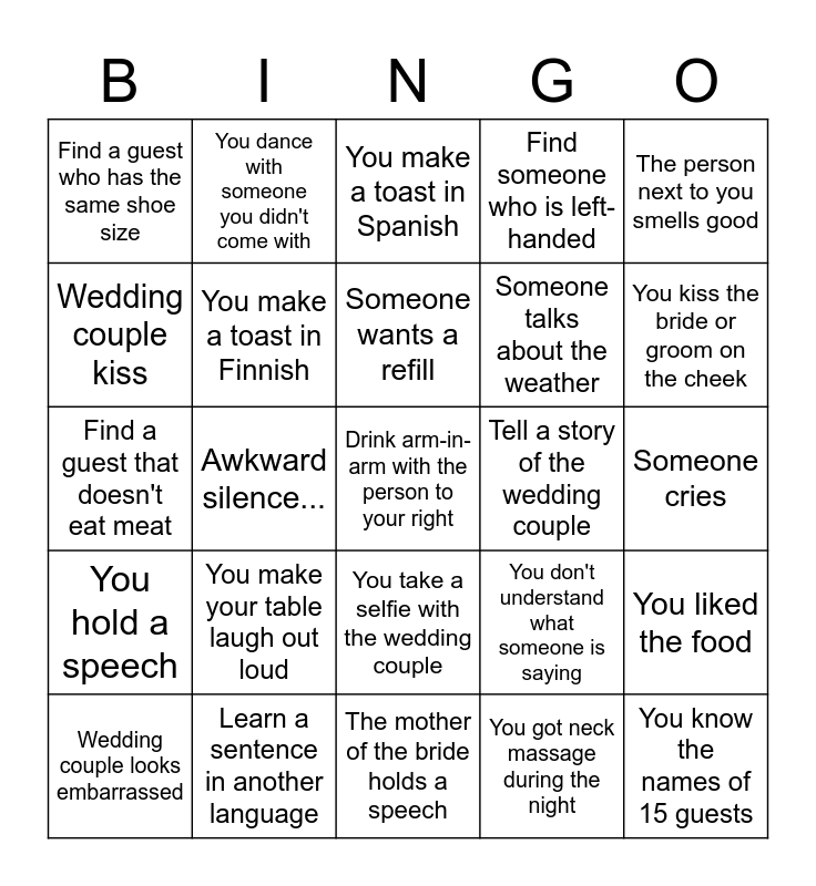 This bingo card has 25 words: You make your table laugh out loud, The mother of the bride holds a speech, Someone wants a refill, Wedding couple looks embarrassed, The person next to you smells good, Find a guest who has the same shoe size, Wedding couple kiss, You dance with someone you didn't come with, Tell a story of the wedding couple, You take a selfie with the wedding couple, Someone talks about the weather, Find a guest that doesn't eat meat, You don't understand what someone is saying, You liked the food, You make a toast in Finnish, You know the names of 15 guests, Someone cries, You make a toast in Spanish, You kiss the bride or groom on the cheek, Awkward silence..., Drink arm-in-arm with the person to your right, Learn a sentence in another language, You hold a speech, Find someone who is left-handed and You got neck massage during the night.