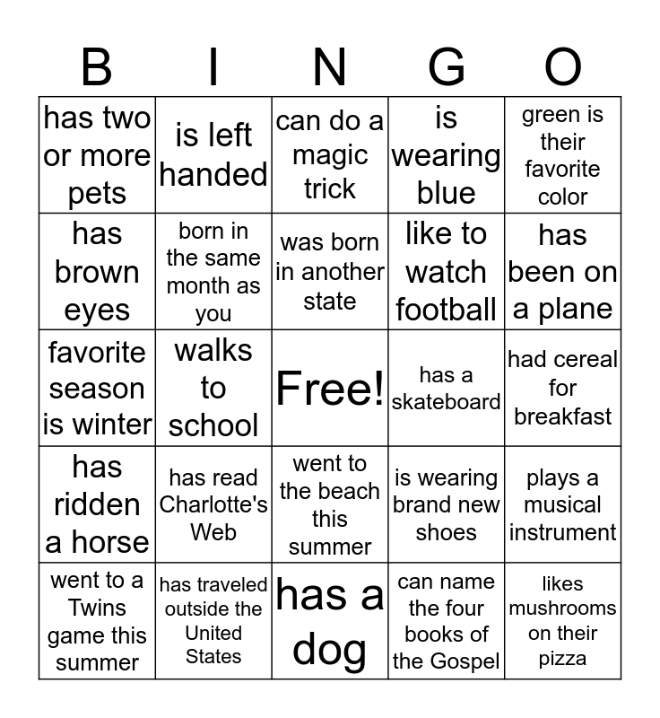 This bingo card has a free space and 24 words: has read Charlotte's Web, has traveled outside the United States, was born in another state, went to a Twins game this summer, green is their favorite color, has two or more pets, has brown eyes, is left handed, has a skateboard, went to the beach this summer, like to watch football, favorite season is winter, is wearing brand new shoes, plays a musical instrument, born in the same month as you, can name the four books of the Gospel, had cereal for breakfast, can do a magic trick, has been on a plane, walks to school, likes mushrooms on their pizza, has ridden a horse, is wearing blue and has a dog.
