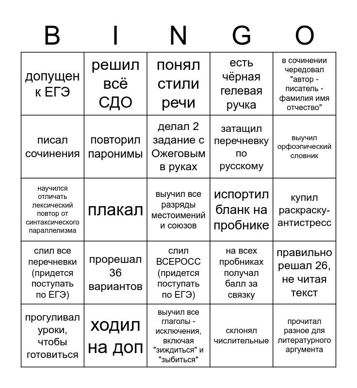 This bingo card has 25 words: прорешал 36 вариантов, выучил все глаголы - исключения, включая "зиждиться" и "зыбиться", делал 2 задание с Ожеговым в руках, прогуливал уроки, чтобы готовиться, в сочинении чередовал "автор - писатель - фамилия имя отчество", допущен к ЕГЭ, писал сочинения, решил всё СДО, испортил бланк на пробнике, слил ВСЕРОСС (придется поступать по ЕГЭ), затащил перечневку по русскому, научился отличать лексический повтор от синтаксического параллелизма, на всех пробниках получал балл за связку, правильно решал 26, не читая текст, повторил паронимы, прочитал разное для литературного аргумента, купил раскраску-антистресс, понял стили речи, выучил орфоэпический словник, плакал, выучил все разряды местоимений и союзов, ходил на доп, слил все перечневки (придется поступать по ЕГЭ), есть чёрная гелевая ручка and склонял числительные.
