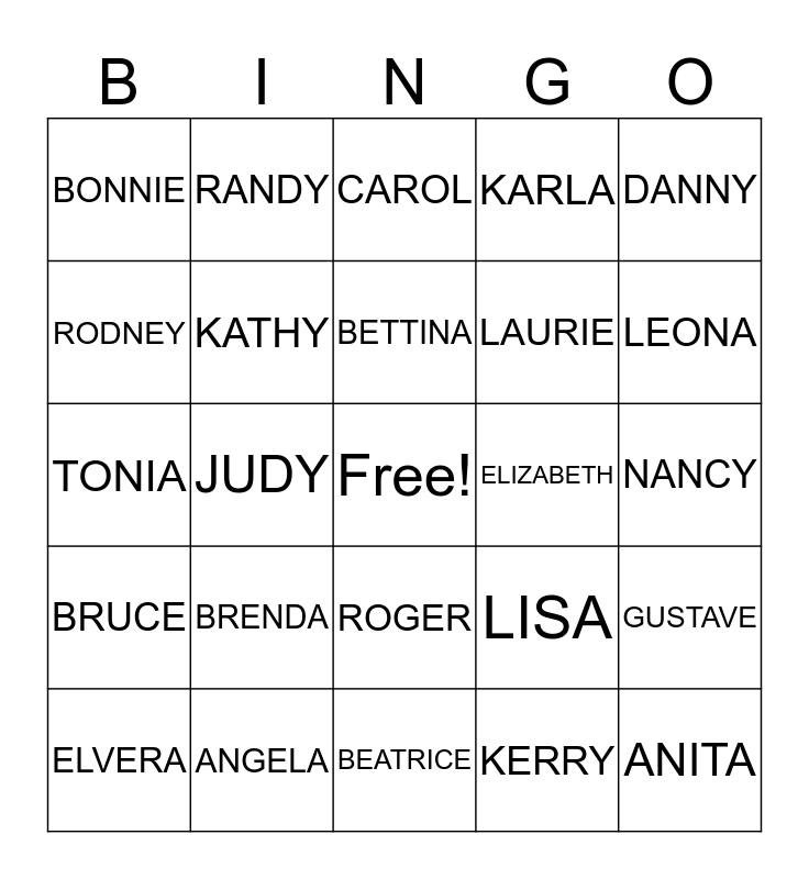 This bingo card has a free space and 24 words: BRENDA, ANGELA, BETTINA, ELVERA, DANNY, BONNIE, RODNEY, RANDY, ELIZABETH, ROGER, LAURIE, TONIA, LISA, GUSTAVE, KATHY, KERRY, NANCY, CAROL, LEONA, JUDY, ANITA, BRUCE, KARLA and BEATRICE.