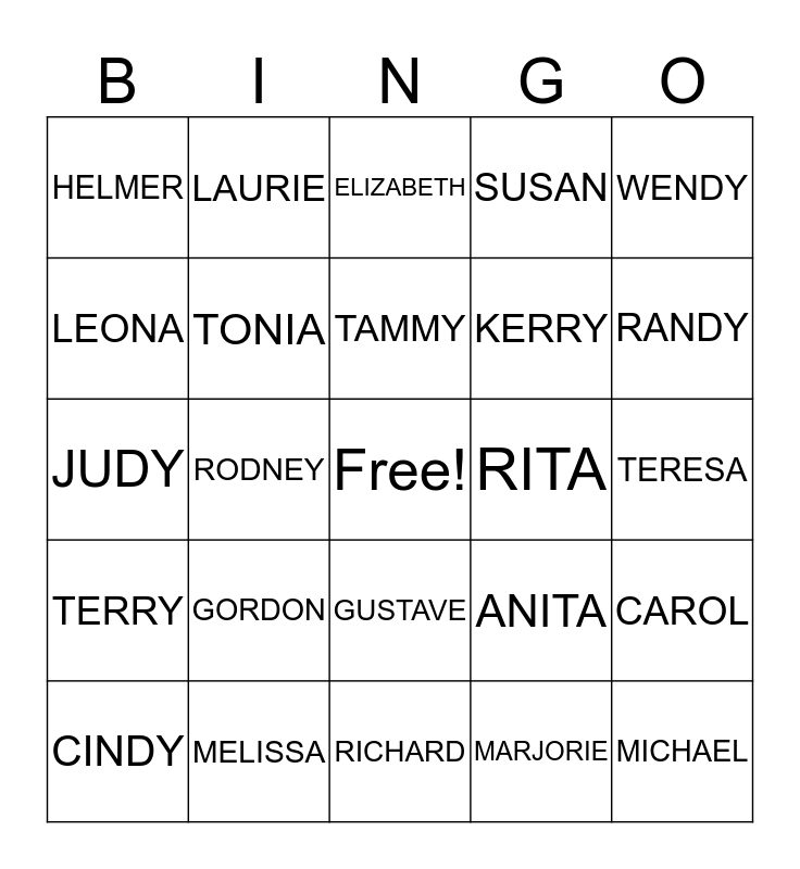This bingo card has a free space and 24 words: GORDON, MELISSA, TAMMY, CINDY, WENDY, HELMER, LEONA, LAURIE, RITA, GUSTAVE, KERRY, JUDY, ANITA, CAROL, TONIA, MARJORIE, TERESA, ELIZABETH, RANDY, RODNEY, MICHAEL, TERRY, SUSAN and RICHARD.