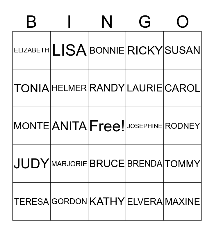 This bingo card has a free space and 24 words: MARJORIE, GORDON, RANDY, TERESA, SUSAN, ELIZABETH, TONIA, LISA, JOSEPHINE, BRUCE, LAURIE, MONTE, BRENDA, TOMMY, HELMER, ELVERA, RODNEY, BONNIE, CAROL, ANITA, MAXINE, JUDY, RICKY and KATHY.