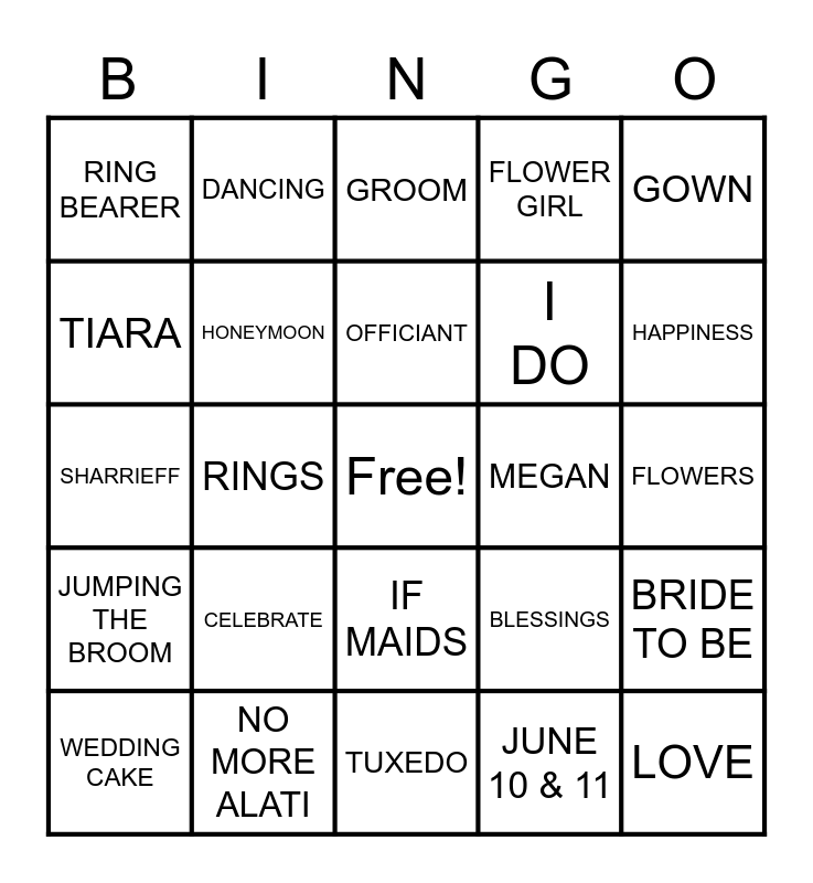 This bingo card has a free space and 24 words: WEDDING CAKE, CELEBRATE, OFFICIANT, JUNE 10 & 11, GOWN, RING BEARER, DANCING, GROOM, MEGAN, FLOWERS, SHARRIEFF, HONEYMOON, BLESSINGS, BRIDE TO BE, TIARA, NO MORE ALATI, TUXEDO, FLOWER GIRL, HAPPINESS, JUMPING THE BROOM, RINGS, IF MAIDS, I DO and LOVE.