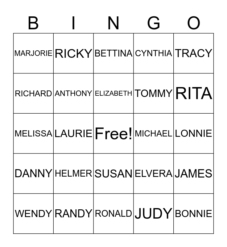 This bingo card has a free space and 24 words: HELMER, RANDY, ELIZABETH, WENDY, TRACY, MARJORIE, RICHARD, RICKY, MICHAEL, SUSAN, TOMMY, MELISSA, ELVERA, JAMES, ANTHONY, JUDY, LONNIE, BETTINA, RITA, LAURIE, BONNIE, DANNY, CYNTHIA and RONALD.