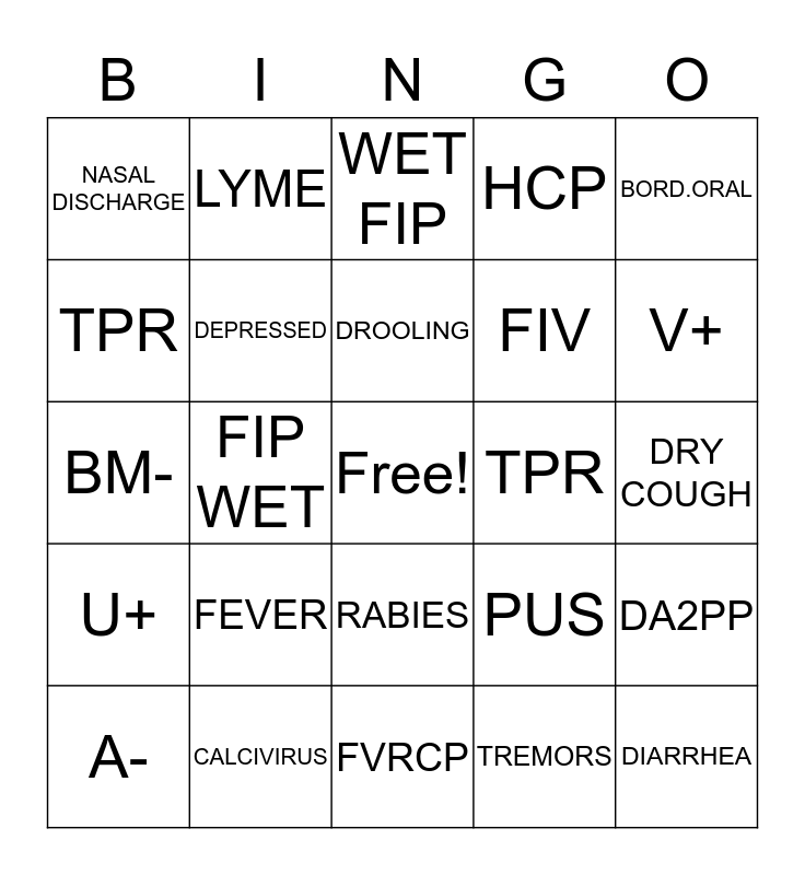 This bingo card has a free space and 24 words: FEVER, CALCIVIRUS, DROOLING, A-, BORD.ORAL, NASAL DISCHARGE, TPR, LYME, TPR, RABIES, FIV, BM-, PUS, DA2PP, DEPRESSED, TREMORS, DRY COUGH, WET FIP, V+, FIP WET, DIARRHEA, U+, HCP and FVRCP.