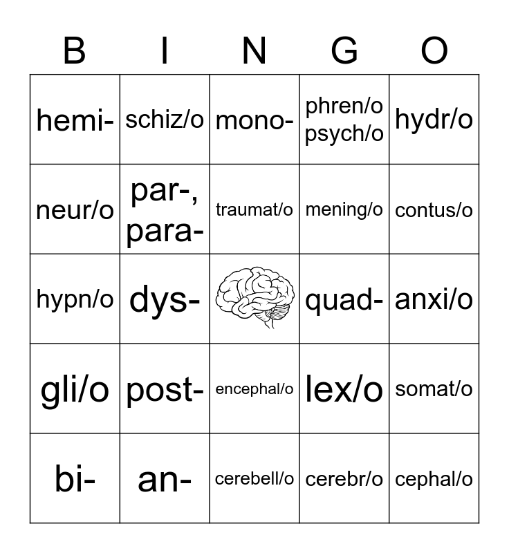 This bingo card has a free space and 29 words: bi-, con-, dys-, en-, hemi-, mono-, par-, para-, post-, quad-, an-, anxi/o, cephal/o, cerebell/o, cerebr/o, contus/o, crani/o, encephal/o, gli/o, hydr/o, hypn/o, lex/o, myel/o, mening/o, neur/o, phren/o psych/o, schiz/o, somat/o, traumat/o and AD.