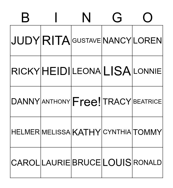 This bingo card has a free space and 24 words: MELISSA, LAURIE, LEONA, CAROL, LOREN, JUDY, RICKY, RITA, TRACY, KATHY, LISA, DANNY, CYNTHIA, TOMMY, HEIDI, LOUIS, BEATRICE, GUSTAVE, LONNIE, ANTHONY, RONALD, HELMER, NANCY and BRUCE.