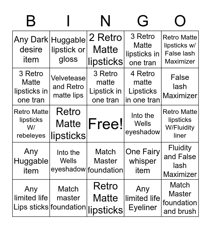 This bingo card has a free space and 24 words: Into the Wells eyeshadow, Match master foundation, 3 Retro matte Lipstick in one tran, Any limited life Lips sticks, Retro Matte lipsticks w/ False lash Maximizer, Any Dark desire item, 3 Retro Matte lipsticks in one tran, Huggable lipstick or gloss, Into the Wells eyeshadow, Match Master foundation, 4 Retro matte Lipsticks in one tran, Retro Matte lipsticks W/ rebeleyes, One Fairy whisper item, Fluidity and False lash Maximizer, Velvetease and Retro matte lips, Any limited life Eyeliner, Retro Matte lipsticks W/Fluidity liner, 2 Retro Matte lipsticks, False lash Maximizer, Retro Matte lipsticks, Match Master foundation and brush, Any Huggable item, 3 Retro Matte lipsticks in one tran and Retro Matte lipsticks.