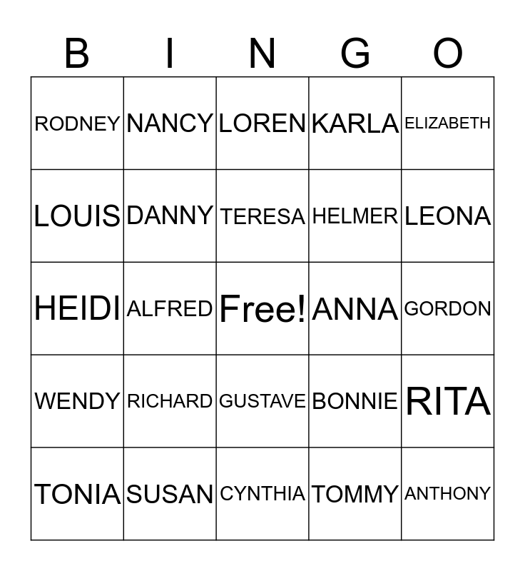 This bingo card has a free space and 24 words: RICHARD, SUSAN, TERESA, TONIA, ELIZABETH, RODNEY, LOUIS, NANCY, ANNA, GUSTAVE, HELMER, HEIDI, BONNIE, RITA, DANNY, TOMMY, GORDON, LOREN, LEONA, ALFRED, ANTHONY, WENDY, KARLA and CYNTHIA.