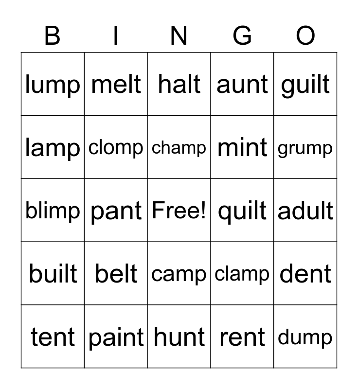 This bingo card has a free space and 24 words: belt, paint, champ, tent, guilt, lump, lamp, melt, quilt, camp, mint, blimp, clamp, dent, clomp, rent, adult, halt, grump, pant, dump, built, aunt and hunt.