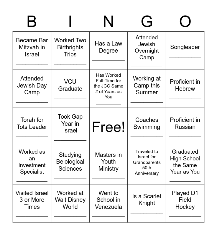 This bingo card has a free space and 30 words: Worked at Walt Disney World __________, Grew up on a Kibbutz __________, Took Gap Year in Israel __________, Coaches Baseball & Basketball __________, Became Bar Mitzvah in Israel __________, Has a Law Degree __________, VCU Graduate __________, Masters in Youth Ministry __________, Coaches Swimming __________, Went to School in Venezuela __________, Proficient in Russian __________, Played D1 Field Hockey __________, Is a Scarlet Knight __________, Working on MPA __________, Proficient in Hebrew __________, Worked Full-Time for BBYO __________, Traveled to Israel for Grandparents 50th Anniversary __________, Worked as an Investment Specialist __________, Studying Beiological Sciences __________, Songleader __________, Torah for Tots Leader __________, Produced & Hosted "Milk & Honey" Radio Show __________, Worked Two Birthrights Trips __________, Working at Camp this Summer __________, Attended Jewish Day Camp __________, Attended Jewish Overnight Camp __________, Graduated High School the Same Year as You __________, Visited Israel 3 or More Times __________, Has Worked Full-Time for the JCC Same # of Years as You __________ and Has Same Job Title as You __________.